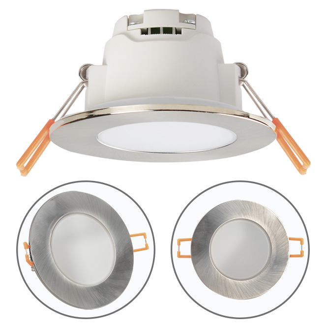 Within the Technical collection, we present to you the downlight XELIM. The measures of this round downlight model are of 0,25 cm high, 9 cm diameter, in satin nickel (IP65). It offers a luminosity of 350 Lumens. The low light temperature of 3000K means a cosy lighting, due to its warm white luminous colour. This is traditionally used for living rooms, bedrooms and dining areas. This model contains 1 LED module of 5W. It has a 120° beam angle.