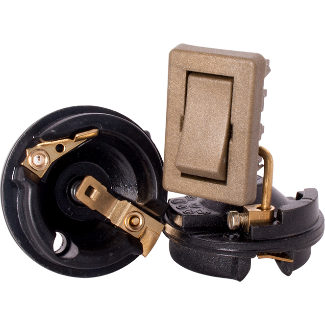 Pastilla de conexión para soporte E27 de 3 piezas, color dorado con interruptor y con sistema de bloqueo antigiro, en baquelita. Adecuado para cables rígidos y flexibles con sección 0, 5-2, 5 mm²