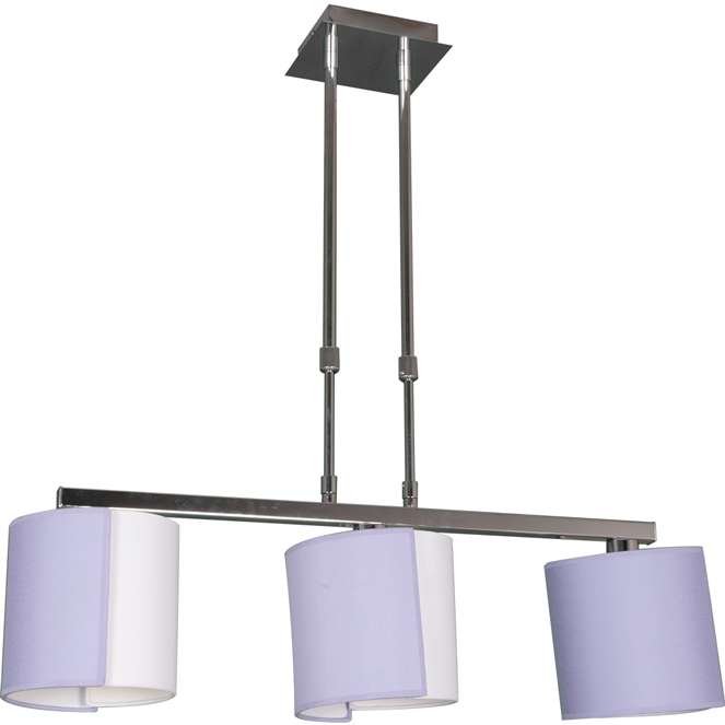 Dentro de la sección Lámparas con Pantalla, les presentamos el artículo lámpara de techo ANDAMAN. Las dimensiones de este modelo de lámpara de techo son de 68 cm de largo, 18 cm de ancho, altura ajustable, en lila, cromo. Este modelo necesita 3 bombillas E14.