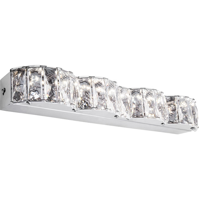 Dentro de la sección Lámparas de Cristal, les presentamos el artículo aplique ZURIQUE. Las dimensiones de este modelo de aplique son de 40 cm de largo, 9 cm de ancho, 6 cm de alto, en cromo. Cuenta con una luminosidad de 1350 Lúmenes. La temperatura de luz mediana de 4000K, luz neutra, es ideal para cocinas, oficinas o similares. Este modelo contiene 1 módulo LED de 16W.