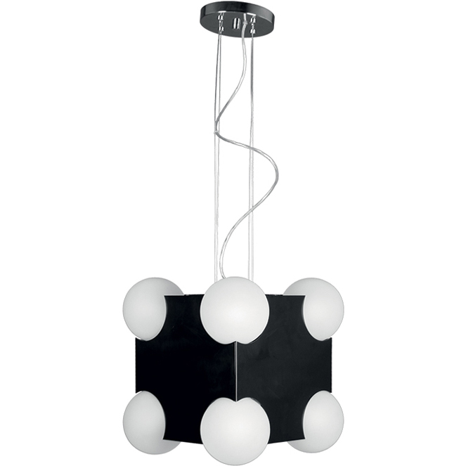 Dentro da secção Candeeiros Diversos, apresentamos o artigo suspensão CUBO. As medidas deste modelo de suspensão são de 34 cm de comprimento, 34 cm de largura, altura regulável, em preto. Este modelo fica completo com 8 lâmpadas E27.
